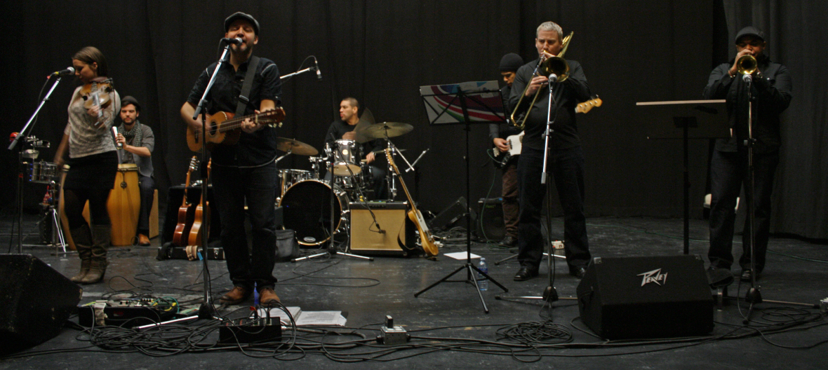 In a 45-minute set, Landa and his band, featuring a violin, guitar, bass, drums, percussion, trumpet, and trombone, brought Latin sounds including an untitled cumbia, a style of music from Colombia. The group also performed traditional sounds of son jarocho, a regional folk music style from Veracruz, Mexico, with “Arenita Azul.” Mixing in a multicultural song with a ska vibe, “America” brought a few spectators up from their seats to dance in front of the stage.